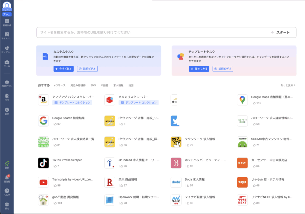 無料でテンプレート機能やデータ加工(カスタマイズ処理)が使えるため、プログラミング知識のないデータ収集初心者でも負担なく使える。