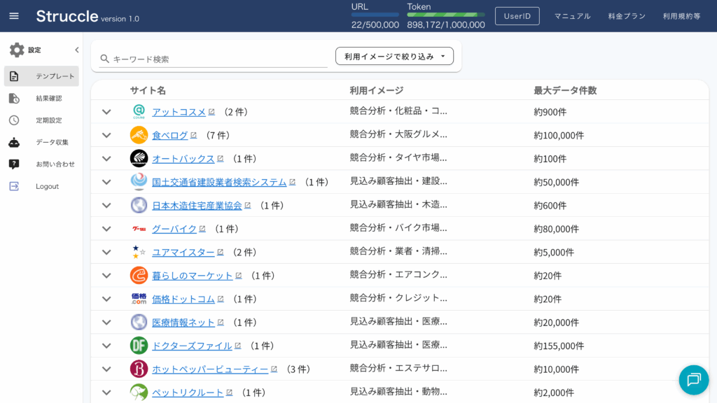 無料で利用開始ができ、テンプレートが豊富なのでプログラミング知識のないデータ収集初心者でも簡単に使うことができる。
