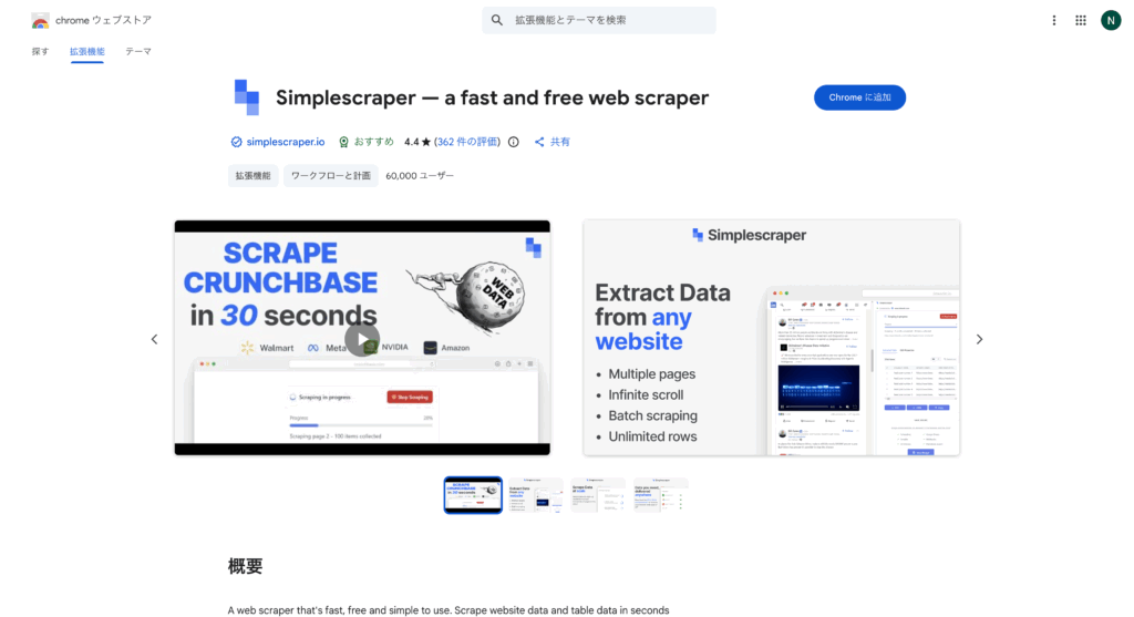 Simplescraperシンプルかつ手軽に使える無料枠あり×AIがデータ検出アシストをしてくれる取得できる場合は細かく取得できる初心者〜中級者△