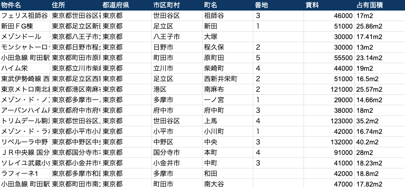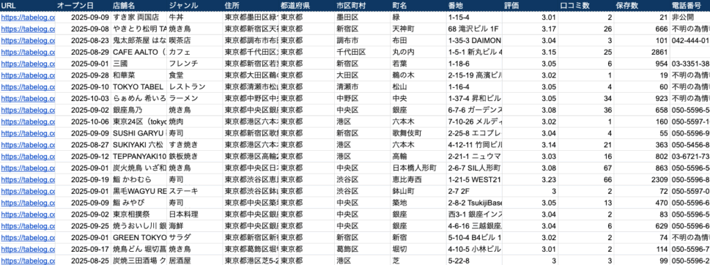 - 項目(データ列):店舗名、住所、電話番号、価格、オープン日 など