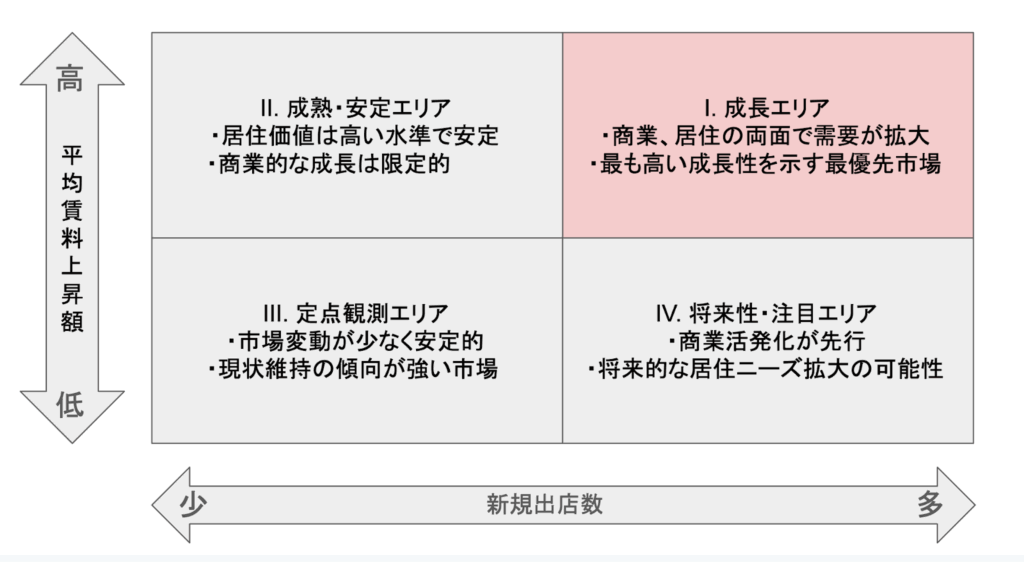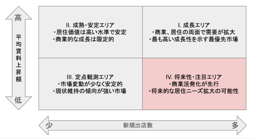 - Y軸(縦):平均賃料上昇額(SUUMO) → 居住ニーズの拡大