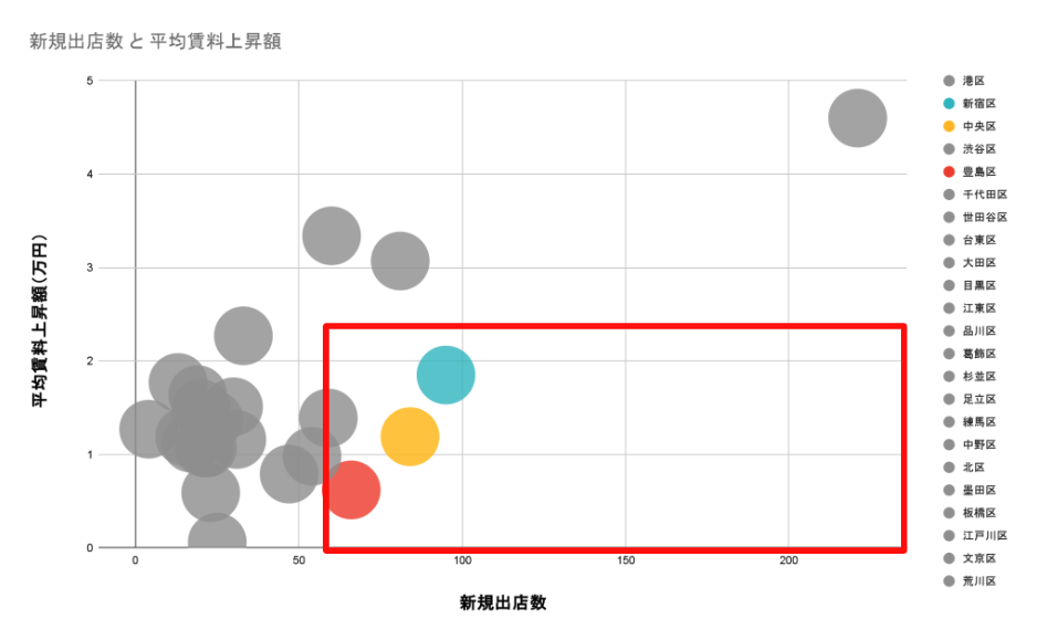 港区とそれ以外の乖離が激しいため今回は港区を外れ値として扱いますが、そうすると豊島区、新宿区、中央区がおおよそ右下にきているのがわかりますね。