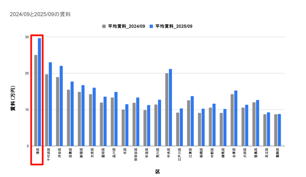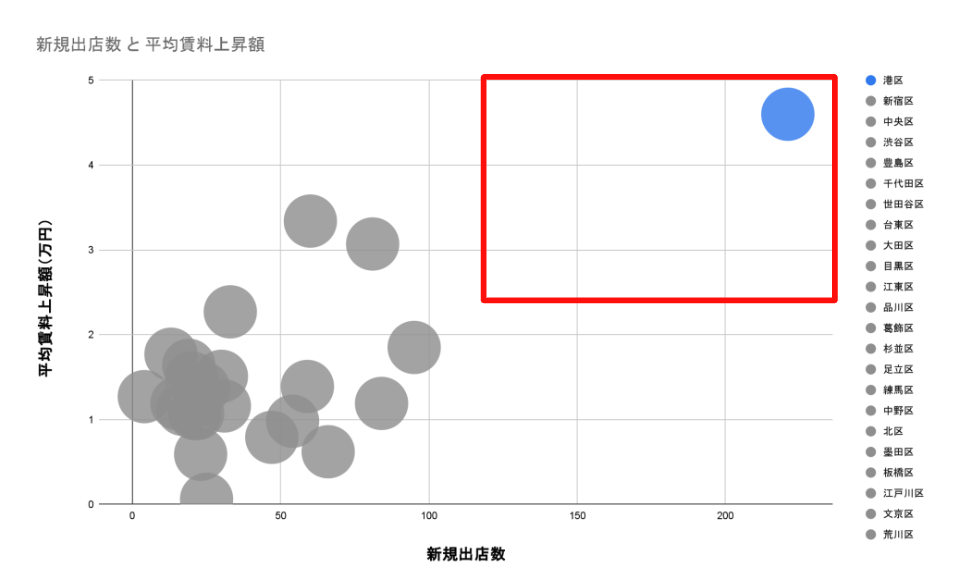 ここに各エリア(区)を値として落とし込むと、港区が突出していることがわかりますね。
