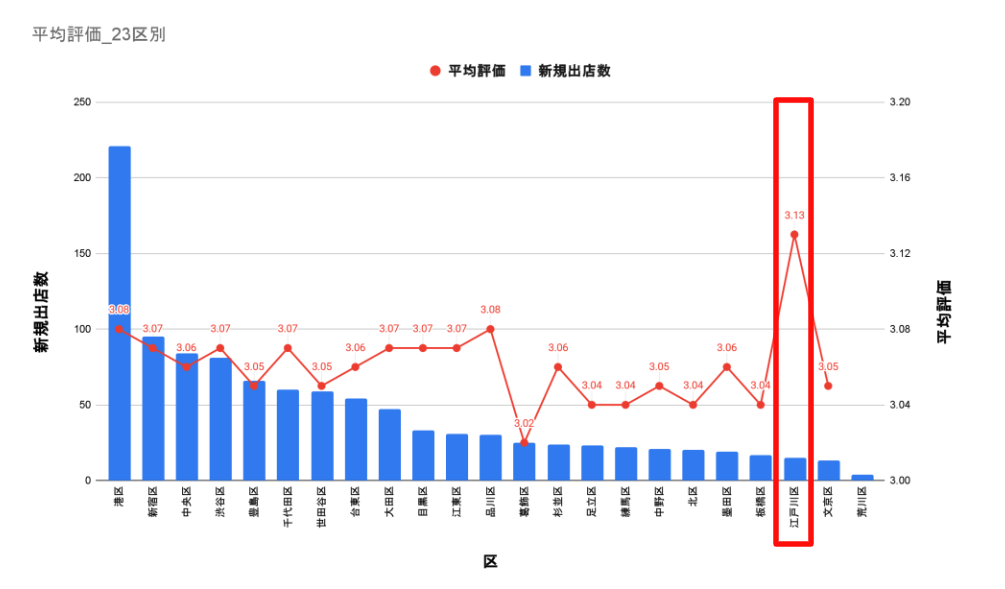 江戸川区は他の区と比べ新規出店数がかなり少ないですが、突出して平均評価が高いということがわかりました。