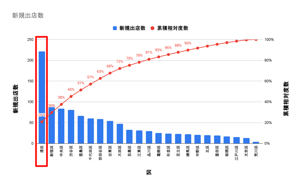 こちらは都内によくいらっしゃる方は想像がつくかと思いますが、エリアとしては港区が最も多く傾向としては主要駅付近の出店数が多く見られました。