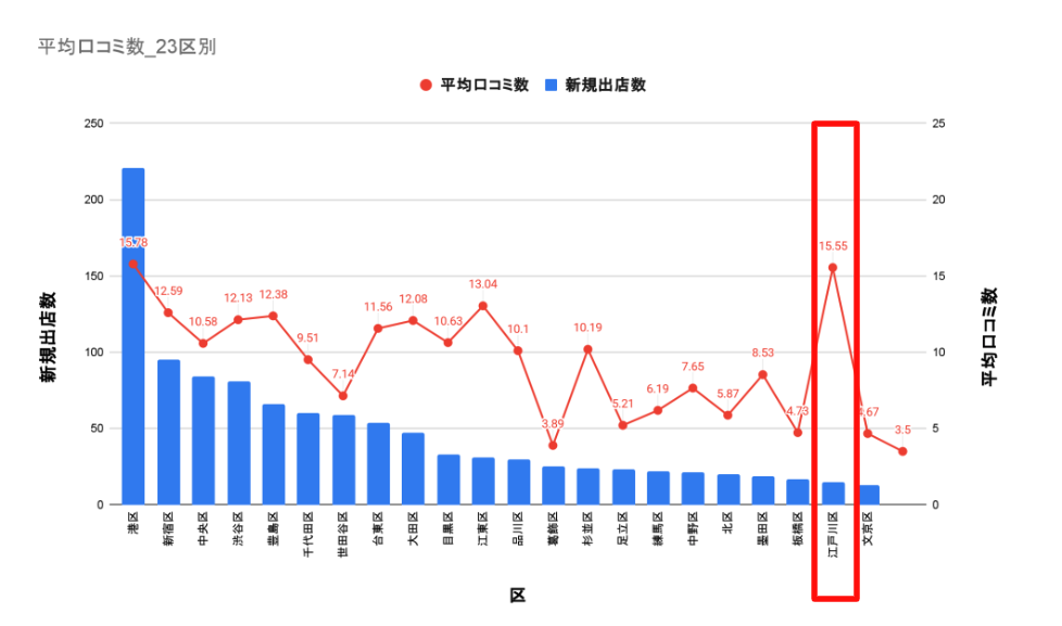そして個人的に意外に思ったのは、「平均評価 – 新規出店数」の複合分析結果における江戸川区です。
