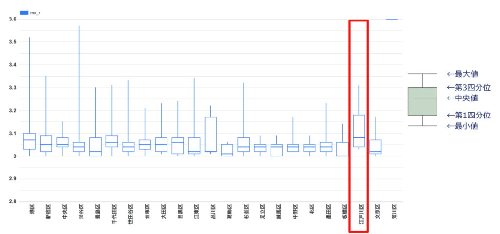 また、箱ひげ図からも江戸川区の新規出店店舗の評価が高いことがわかります。