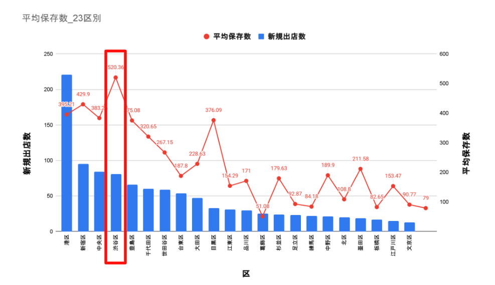 また、「新規出店数 – 平均保存数」の複合分析結果における渋谷区も興味深い結果となりました。