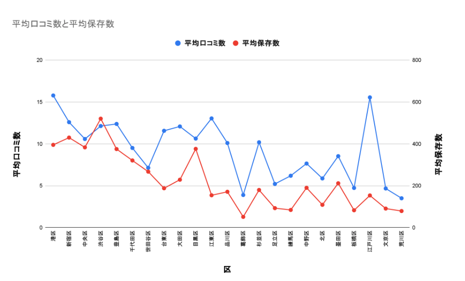 平均口コミ数と平均保存数を比較するとは概ね似たような傾向があることがわかります。