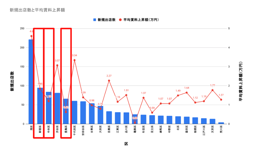 平均賃料の上昇額、新規出店数共に最も多いことから都内最大の成長エリアということが言えます。