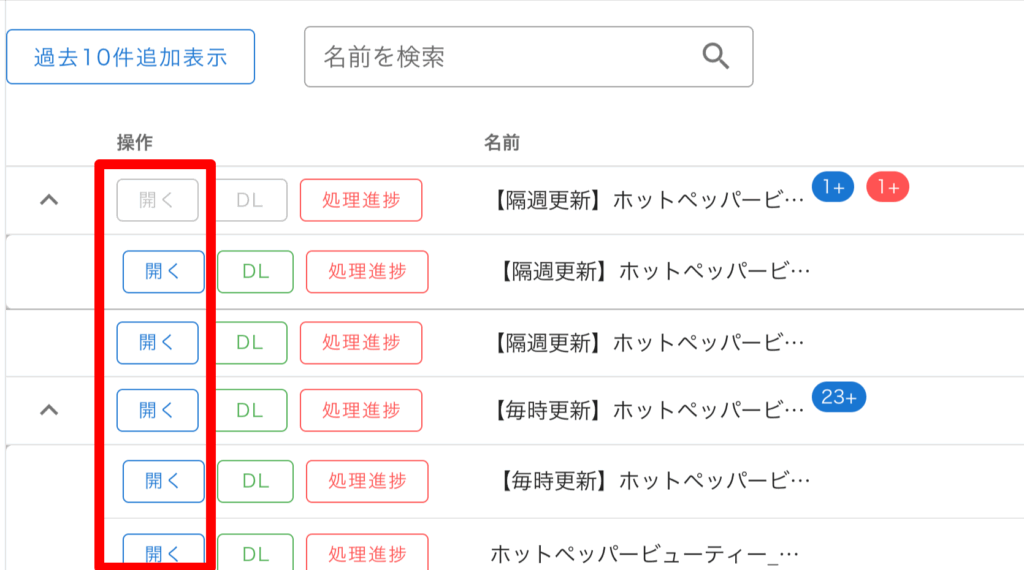また、この詳細画面でデータ加工やカスタム処理、データのダウンロード(DL)も可能です。