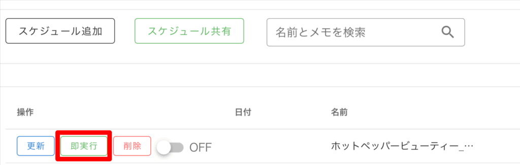 「即実行」を押すと、スケジュール設定とは関係なく、今すぐスケジュールタスクが実行されます。