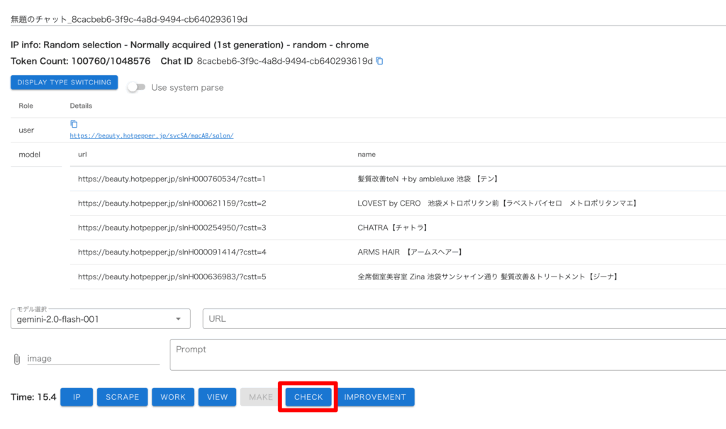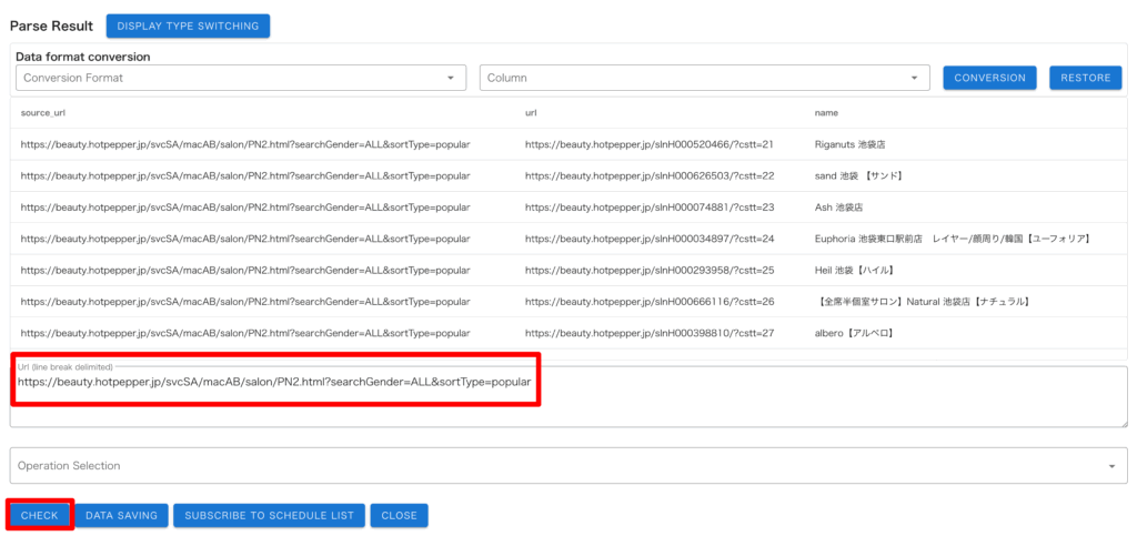 ・「Url(line break delimited)」に一覧ページ URL を入力して「CHECK」を押すとデータ取得ができるので、別の一覧ページ URL を入力するなどしてパーサーの汎用性を確認