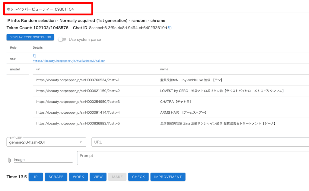 ・「Url(line break delimited)」に詳細ページ URL を入力して「CHECK」を押すとデータ取得ができるので、別の詳細ページ URL を入力するなどしてパーサーの汎用性を確認