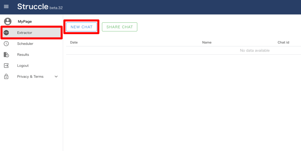 ・「Extractor」メニュー > 「NEW CHAT」でパーサーを新規作成