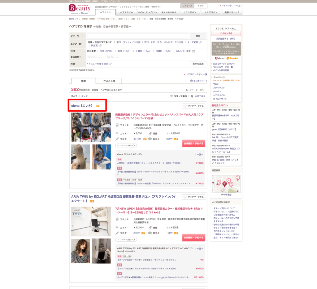 今回のゴールは店舗検索結果 1 ページ目に表示された「池袋・目白のヘアサロン店舗情報を取得」とします。