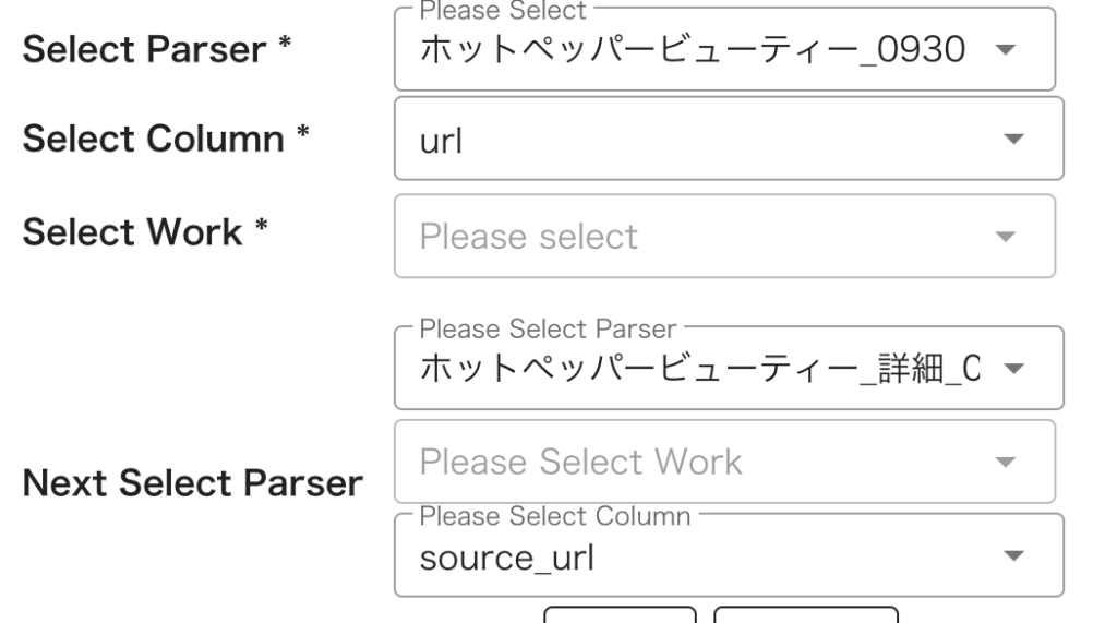 「Select Parser *」には先ほど作成した詳細ページパーサーをセットし、