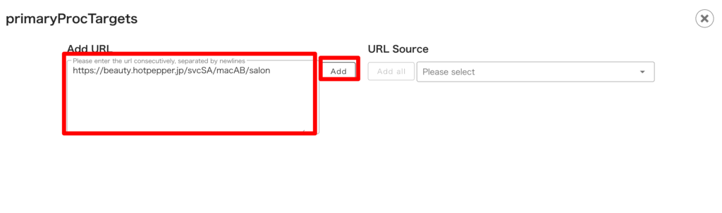 ・「Select URL *」にはスクレイピング対象 URL(一覧ページ URL)を入力して Add を押して追加