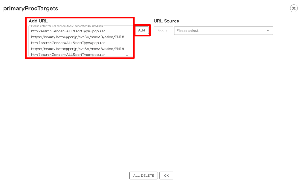 ・「Select URL *」にはスクレイピング対象 URL(ページネーション URL)を入力して Add を押して追加します