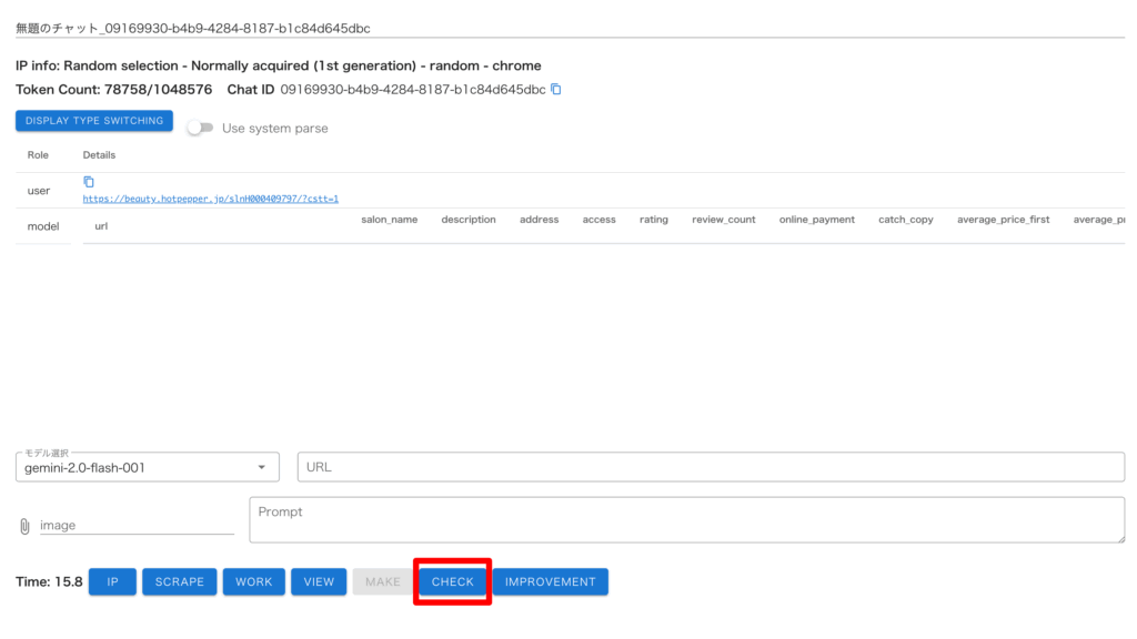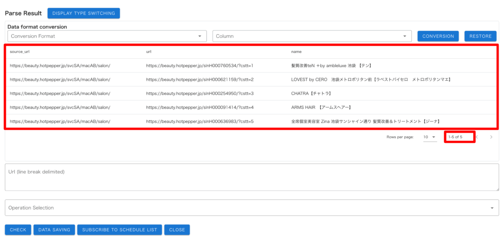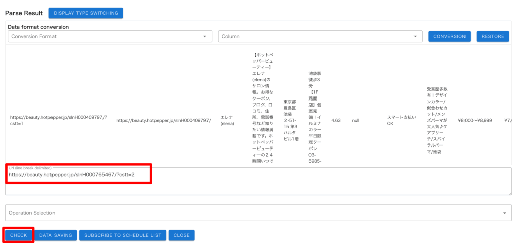 ・「Url(line break delimited)」に一覧ページ URL を入力して「CHECK」を押すとデータ取得ができるので、別の一覧ページ URL を入力するなどしてパーサーの汎用性を確認