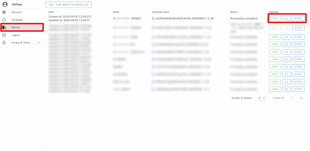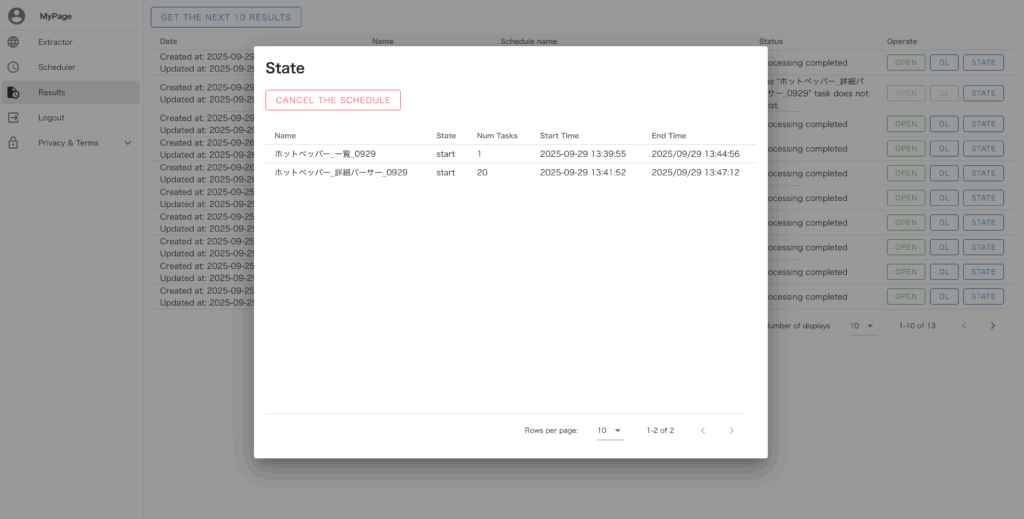 「Result」メニューから Scheduler タスクの実行状況確認や、完了した収集データをダウンロードできます。