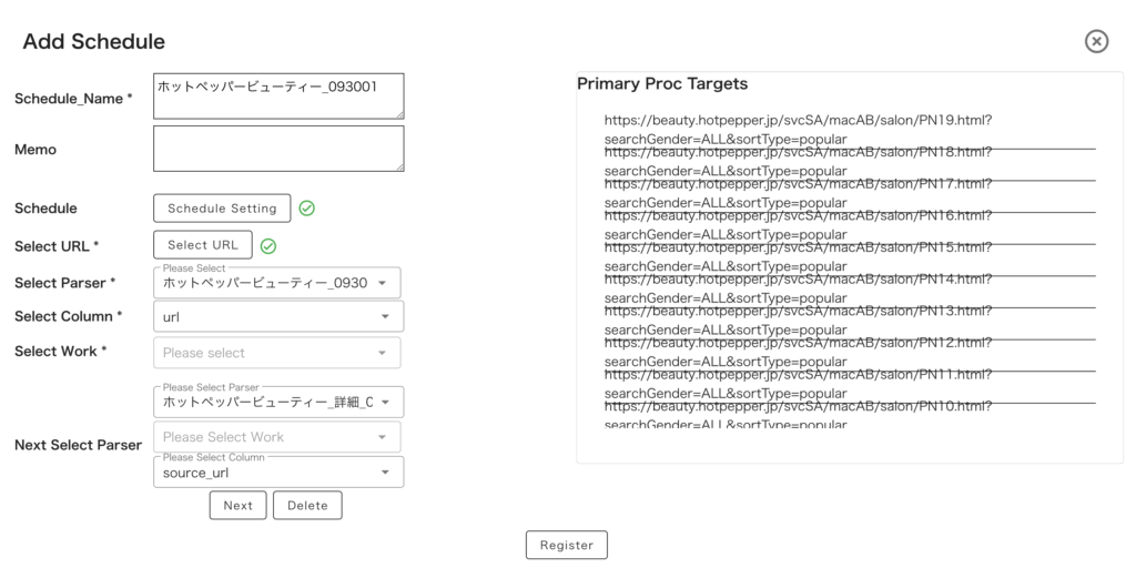 ④ Scheduler でタスク作成(一覧・詳細パーサーを紐付ける)