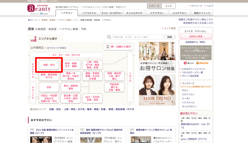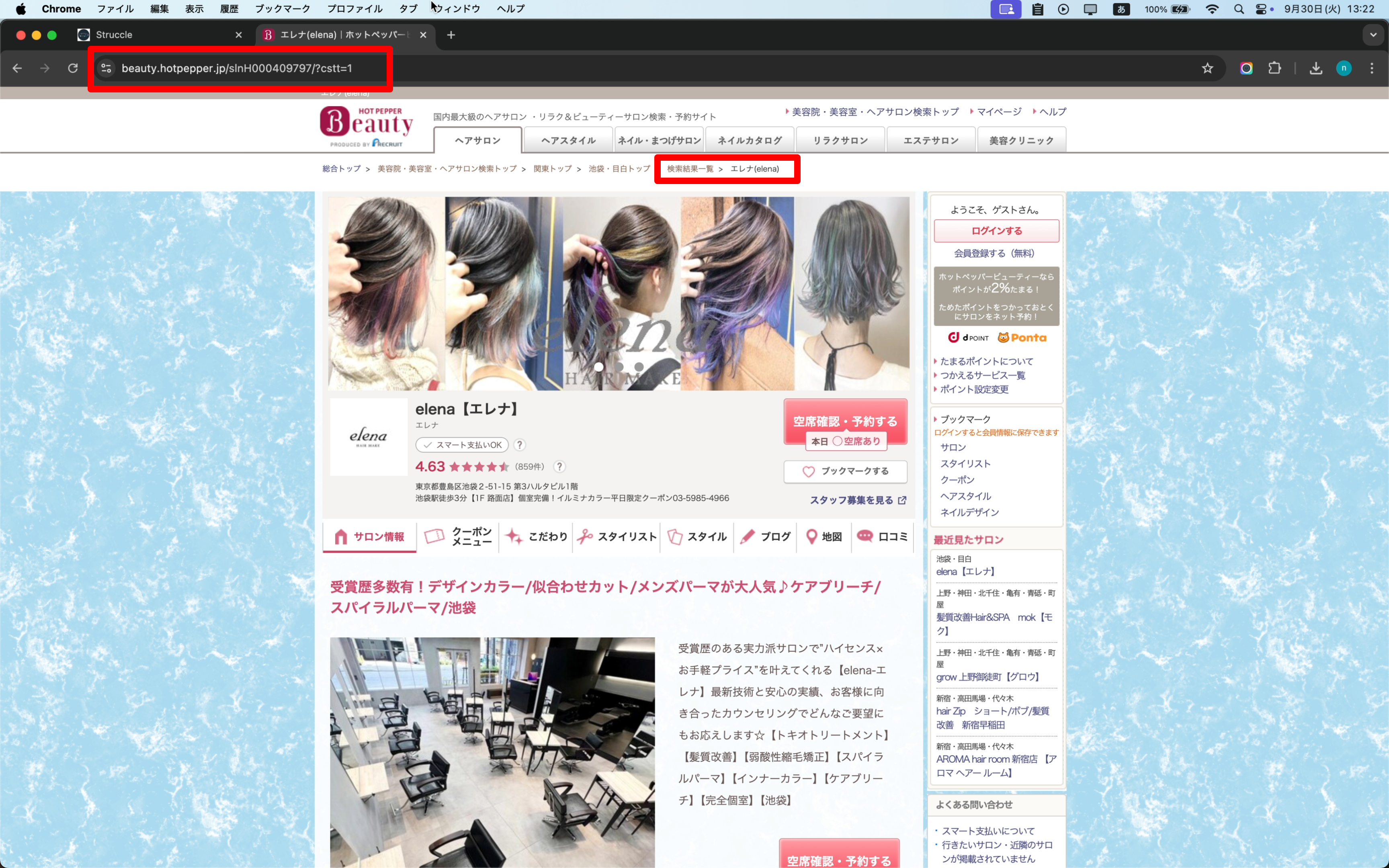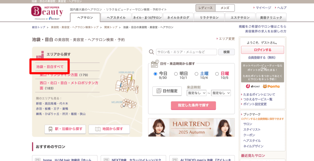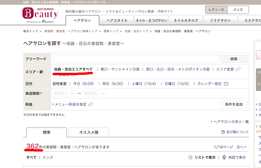 今回のゴールはホットペッパービューティーで店舗検索した際の「池袋・目白エリアすべて」のヘアサロン店舗情報を取得することになります。