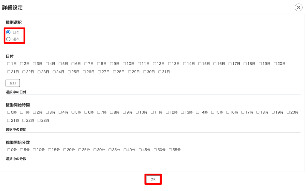 1:「スケジュール」を押下し、詳細設定(ポップアップ)を開いて「日次」か「週次」かを選択。