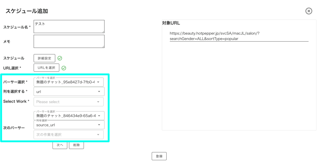 セットするパーサーは、上流(大枠) > 下流 (詳細)のデータに向かって取得するため、一覧パーサー > 詳細パーサー の順序でセットします。