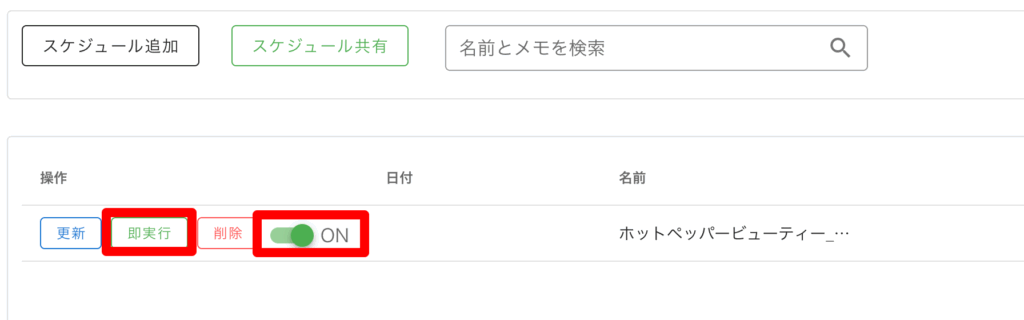 「即実行」を押下して今すぐスクレイピングを開始する、もしくは「OFF」を「ON」に切り替えてスケジュールを有効化してスクレイピングを実行します。