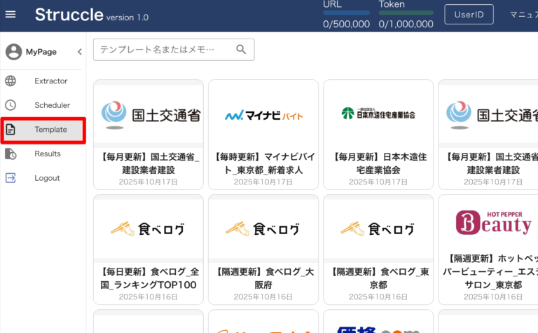 「Template」メニューから、取得したいサイトのテンプレートを取得します。