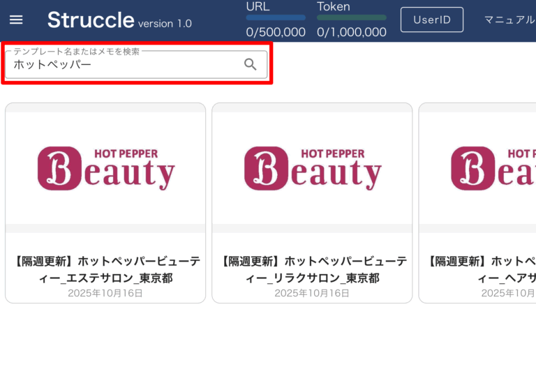 検索窓に「ホットペッパー」と入力するとテンプレートが表示されます。