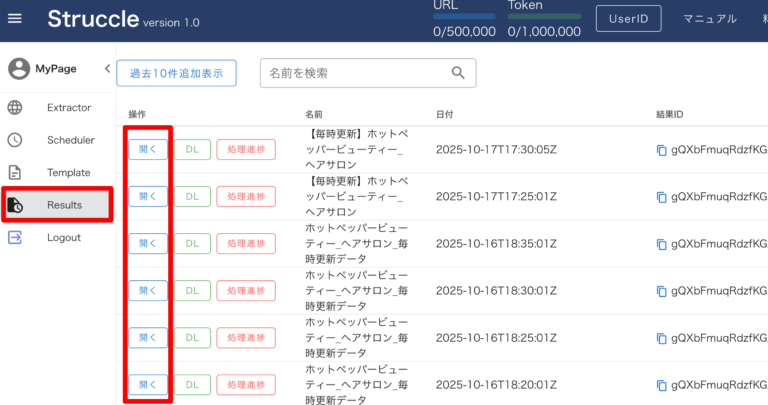 「Results」メニューから、当該データの「開く」ボタンを押します。