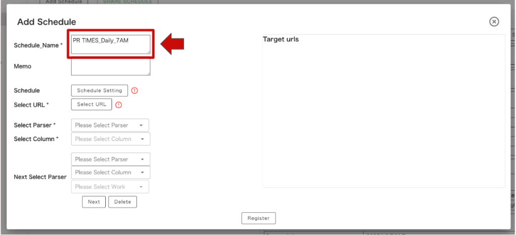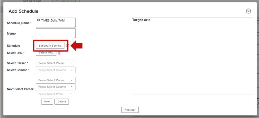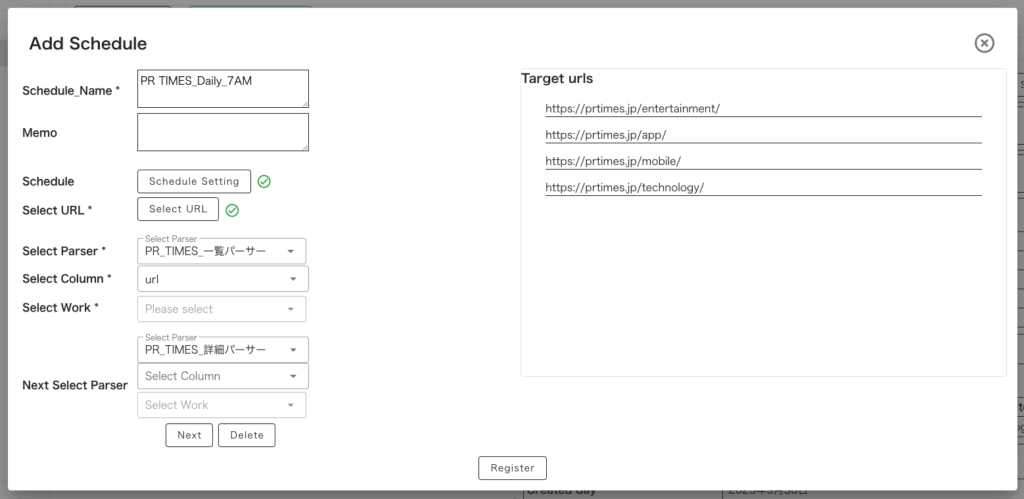 Scheduler ページでは、Extractor で作成したパーサーを登録し、データ収集タスクを自動実行できます。