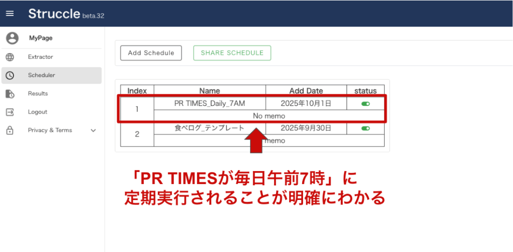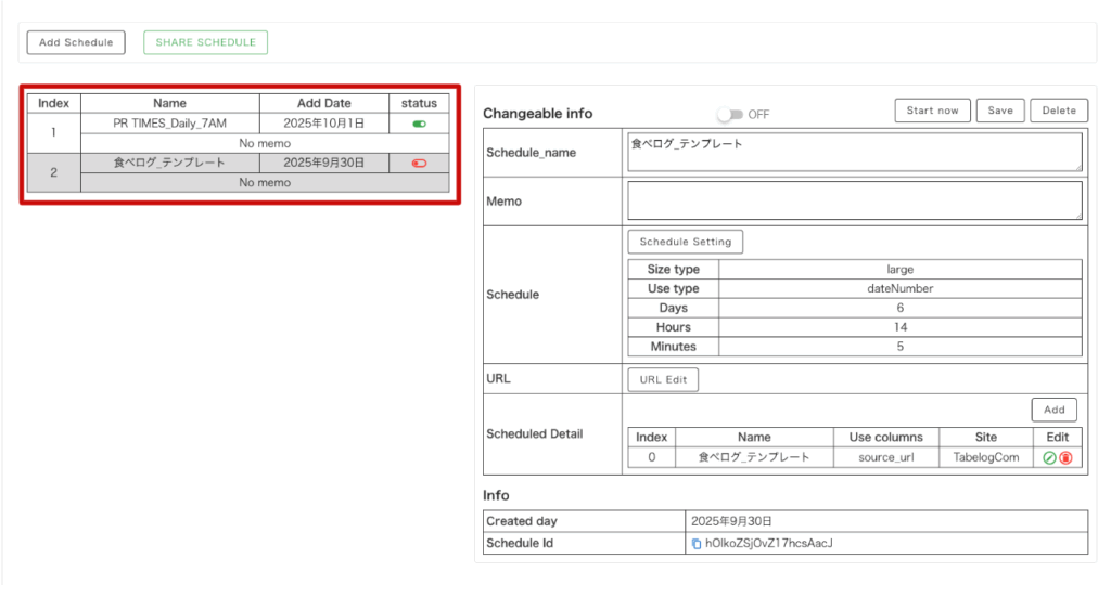 添付画像では「PR TIMES_Daily_7AM」が定期的に事項され、「食べログ_テンプレート」は実行されない状態です。