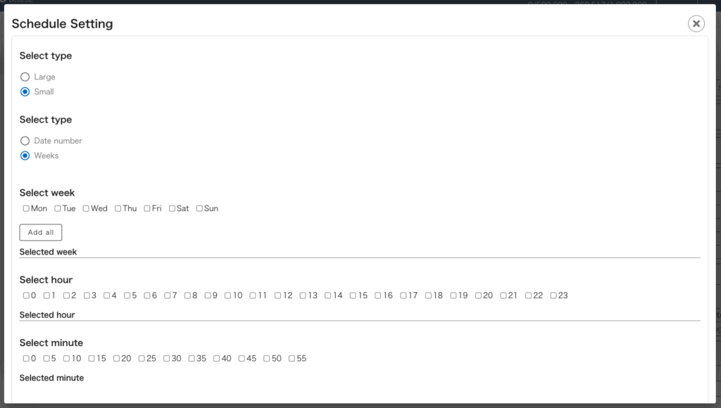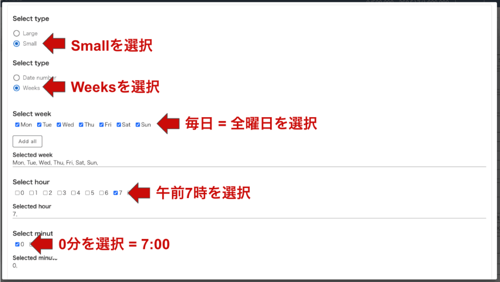 - 「Select minute」:実行したい分を0分から55分まで5分刻みで選択できます。