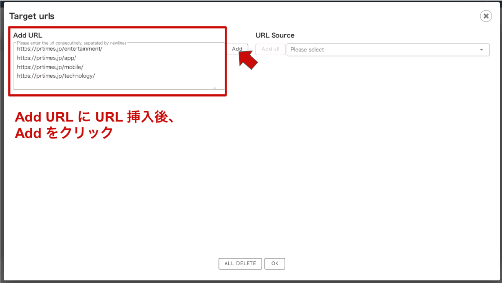 全ての URL の入力が完了したら、画面上部の「Add」 ボタンで設定を確定します。URL の挿入を確認し、「OK」ボタンで URL 設定が完了します。