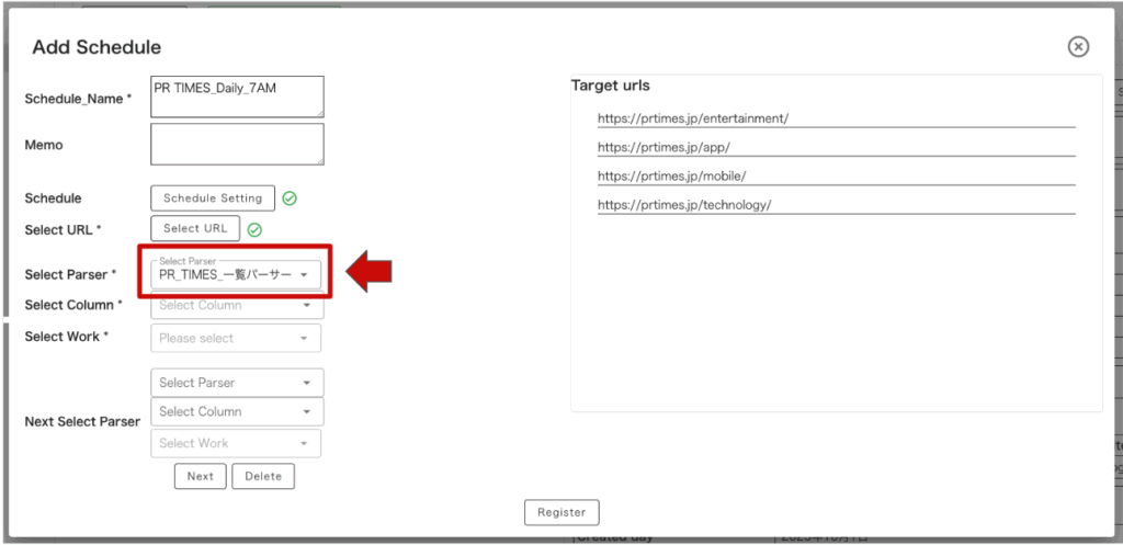 添付画像のように、一番上の「Select Parser」のドロップダウンリストから、PR TIMESのプレスリリース「一覧ページ」を処理するパーサーを選択してください。(例:「PR_TIMES_一覧パーサー」)