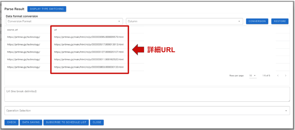 ここで指定されたカラムに含まれるURLが、次のステップで使う「詳細パーサー」の入力となります。