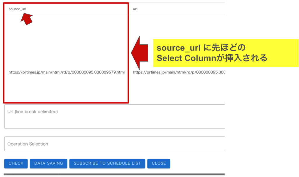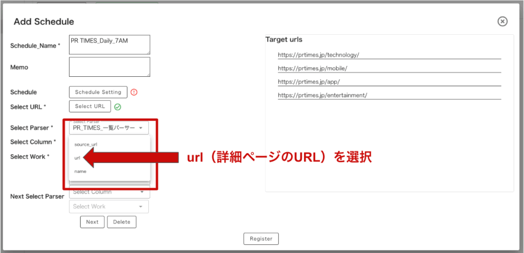 次に、その下の「Select Column」のドロップダウンリストから、1-1で選択したパーサーが一覧ページから取得した情報の中から、「次にアクセスする詳細ページのURL」が格納されているカラム(列)を選択します。(例:「url」)