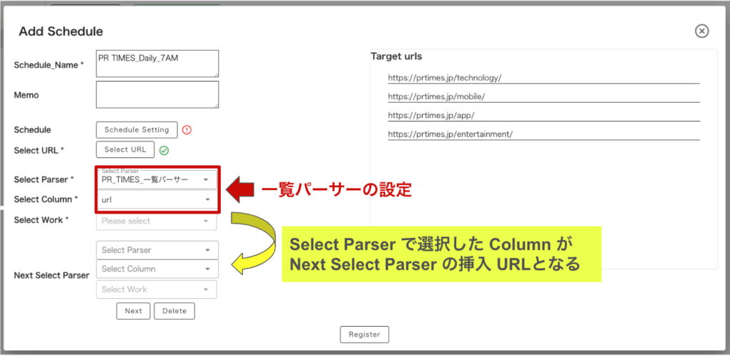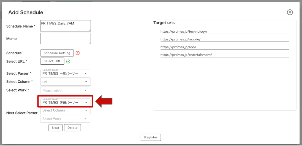 「Next Select Parser」の「Select Parser」のドロップダウンリストから、PR TIMESの各プレスリリースの「詳細ページ」を処理するためのパーサーを選択してください。(例:「PR_TIMES_詳細パーサー」)