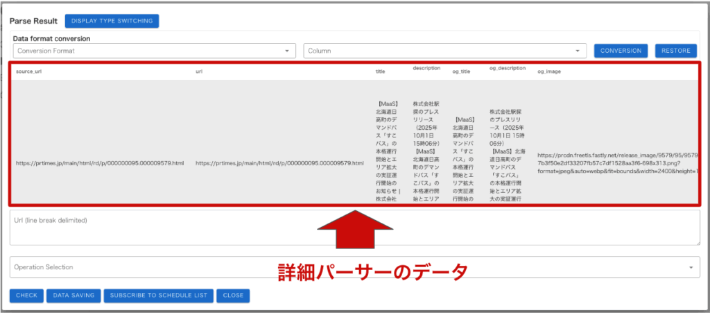このパーサーは、先ほど「Select Column」で指定した「詳細URL」を使って各プレスリリースの詳細ページにアクセスし、そのページから「タイトル」「本文」「発表日」などの具体的なデータを収集します。