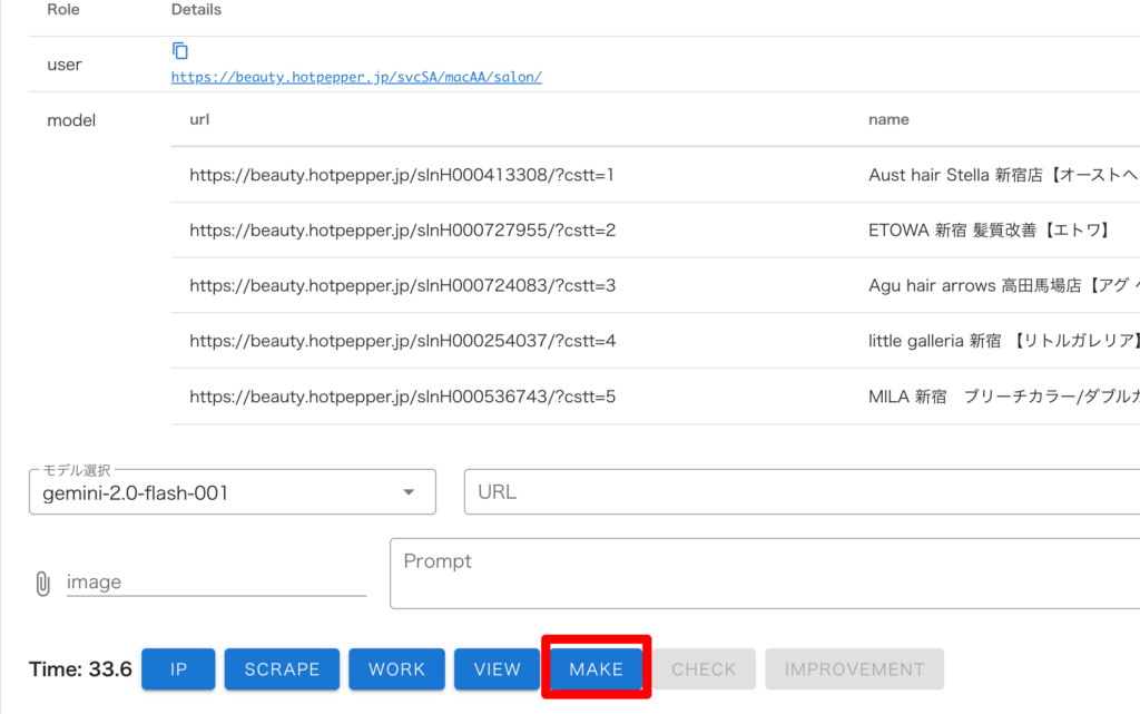 スクレイピングモデルが生成されるので「MAKE」を押下し、データ取得を開始します。
