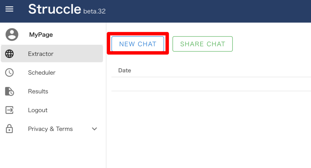 メニュー「Extractor」で「NEW CHAT」を押下します。