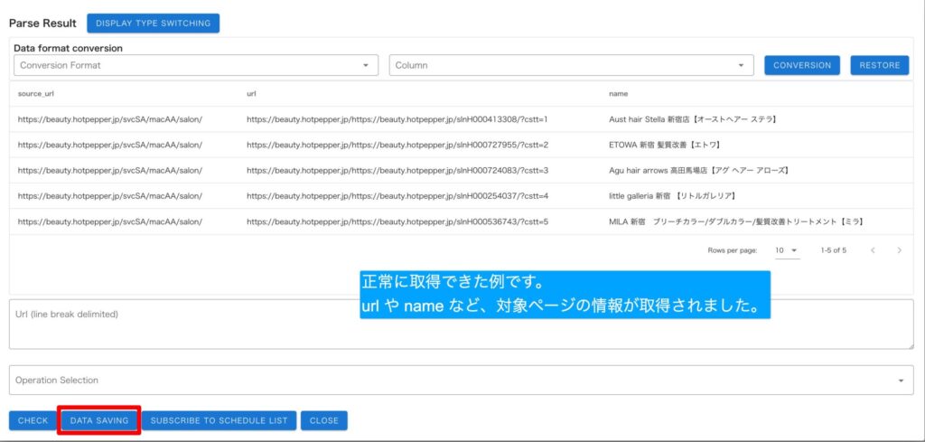 CHECK 画面(Parse Result)の下部にある「DATA SAVING」を押すと CSV でデータが取得できます。